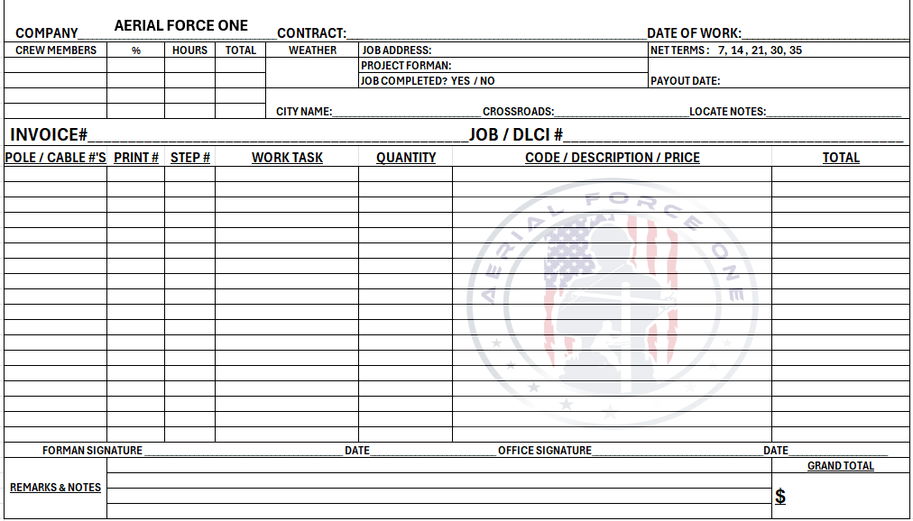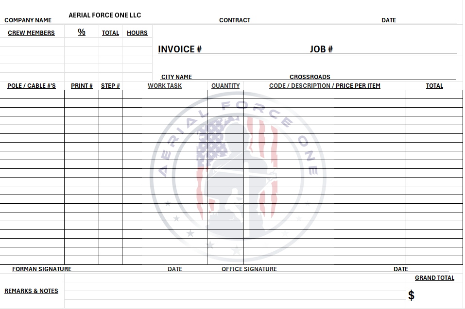 At Aerial Force One LLC, our mission is to provide top-tier utility line services with a steadfast commitment to quality, safety, and customer service. We believe that excellence starts with our people—that’s why we invest in the growth, training, and well-being of our employees and subcontractors. By ensuring our teams are equipped with the skills and support they need, we deliver reliable, efficient, and safe solutions to every project. Together, we keep essential infrastructure strong, connected, and built to last.